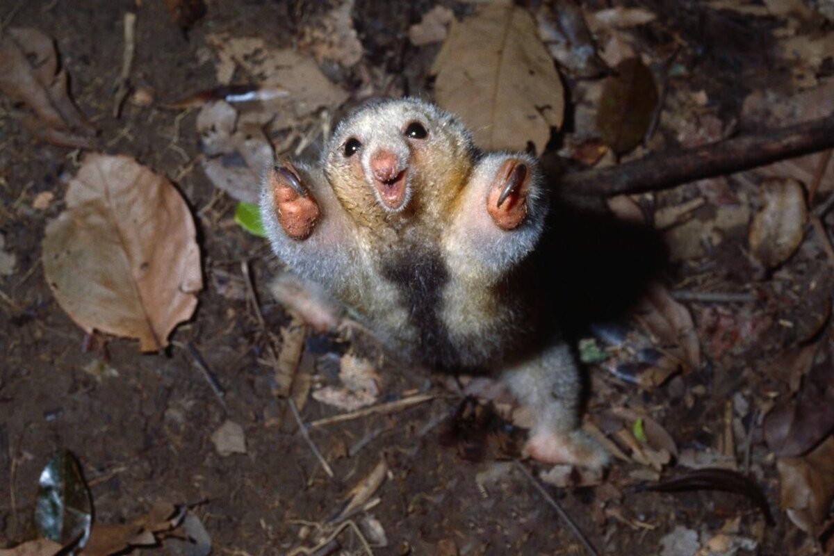 Передние лапки животины оборудованы мощными когтями. Ими удобно вскрывать не только пиво после работы, но и кору дерева, где прячутся различные жуки и личинки. Длинный цепкий хвост помогает коротышу комфортно чувствовать себя в кроне деревьев.
