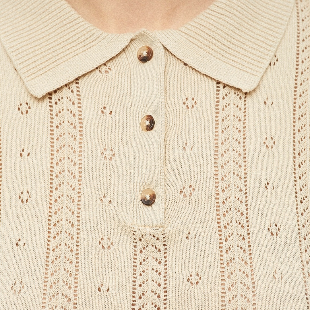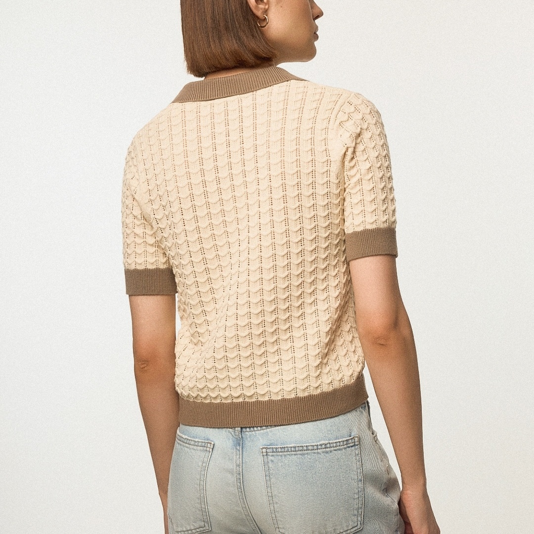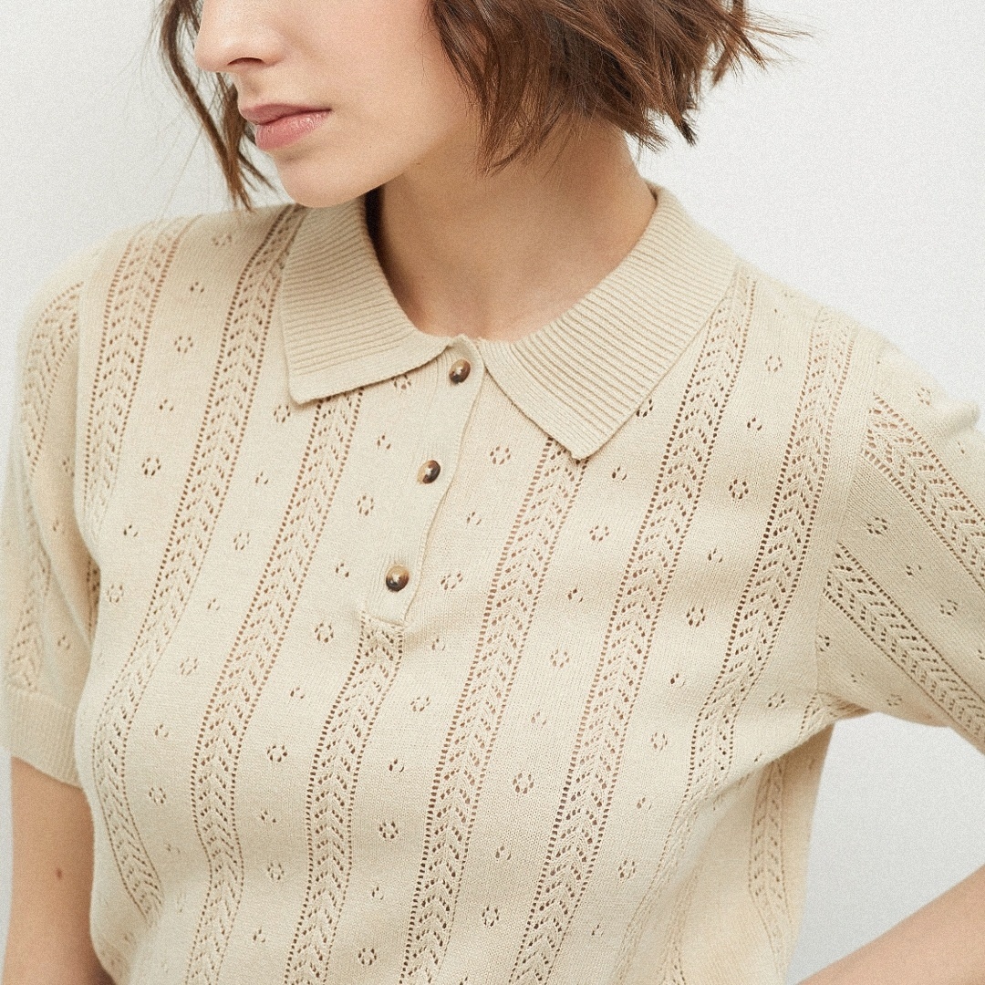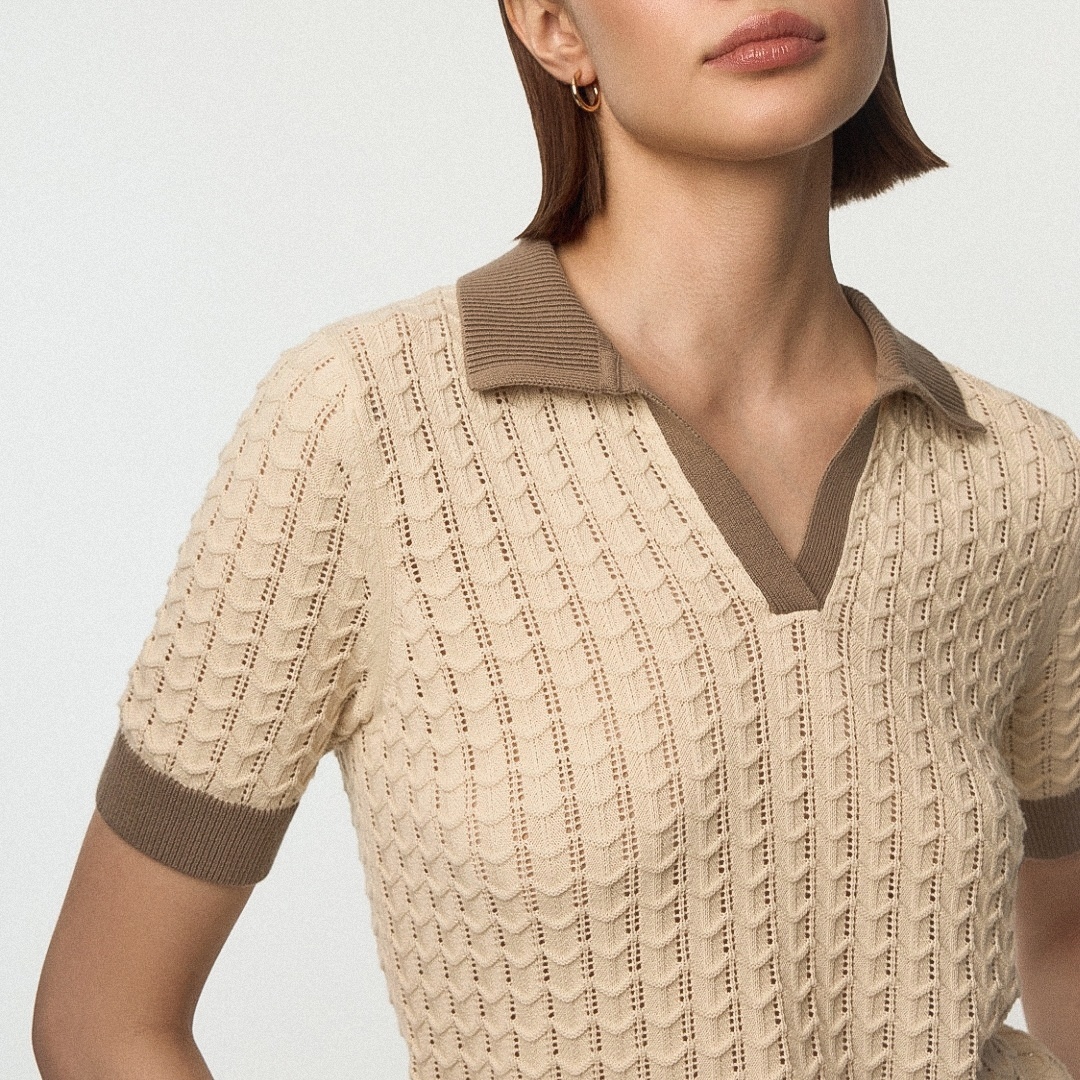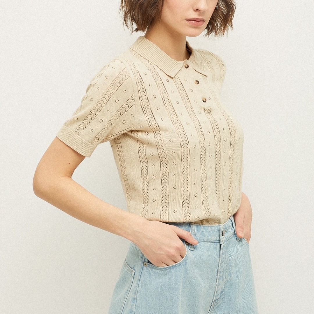 Первая модель — вязаное поло с вертикальными дорожками и дырочками от российского бренда SELA.