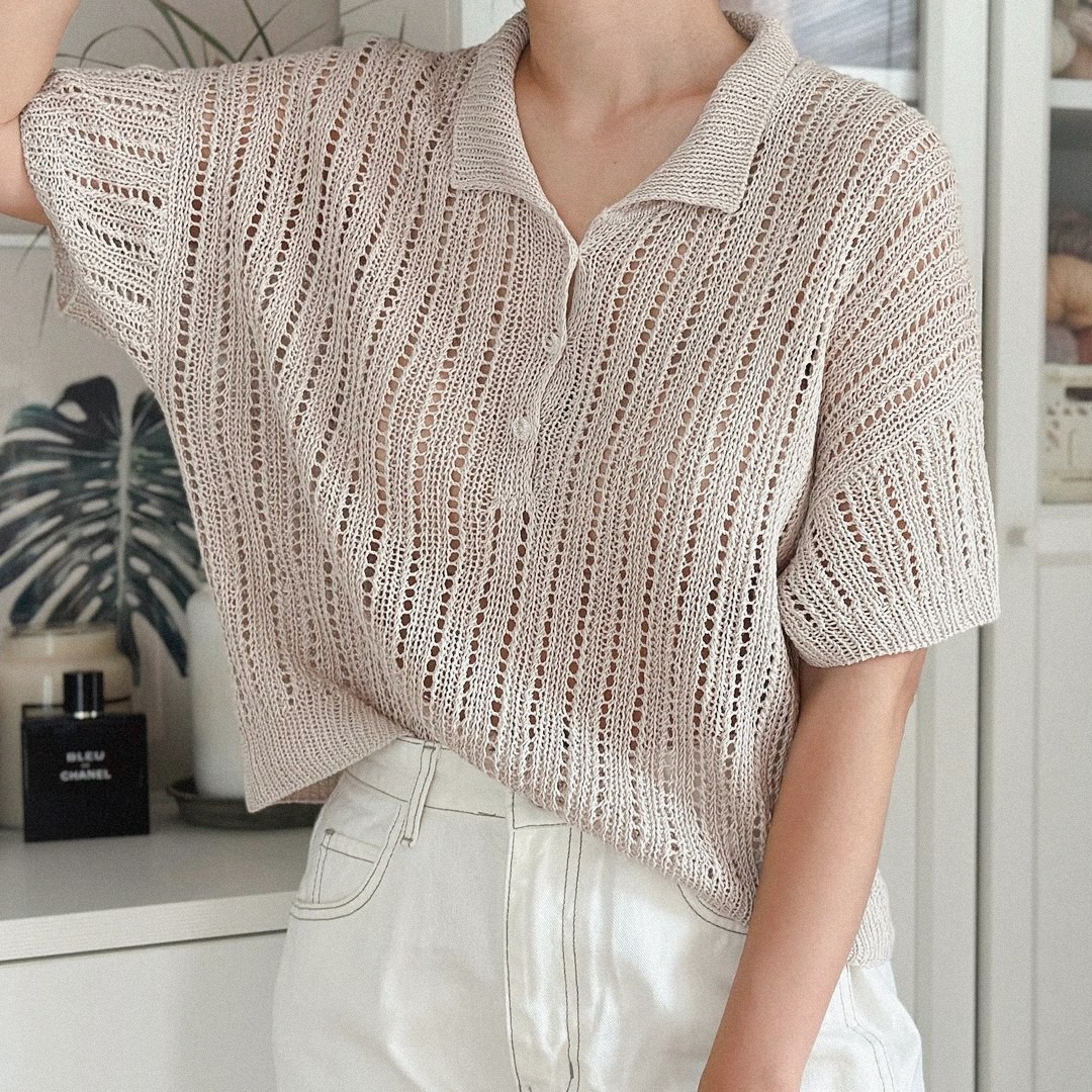 И третья модель — лёгкое ажурное поло расслабленного фасона со спущенной линий плечевого шва. Изделие выглядит нежно благодаря воздушному узору и легкой пряже.