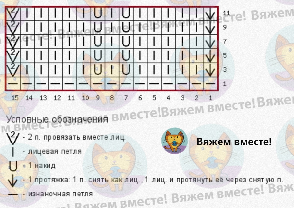 Раппорт узора равен 15 петлям по ширине полотна и 11 рядам по высоте, выделен красной рамкой.
