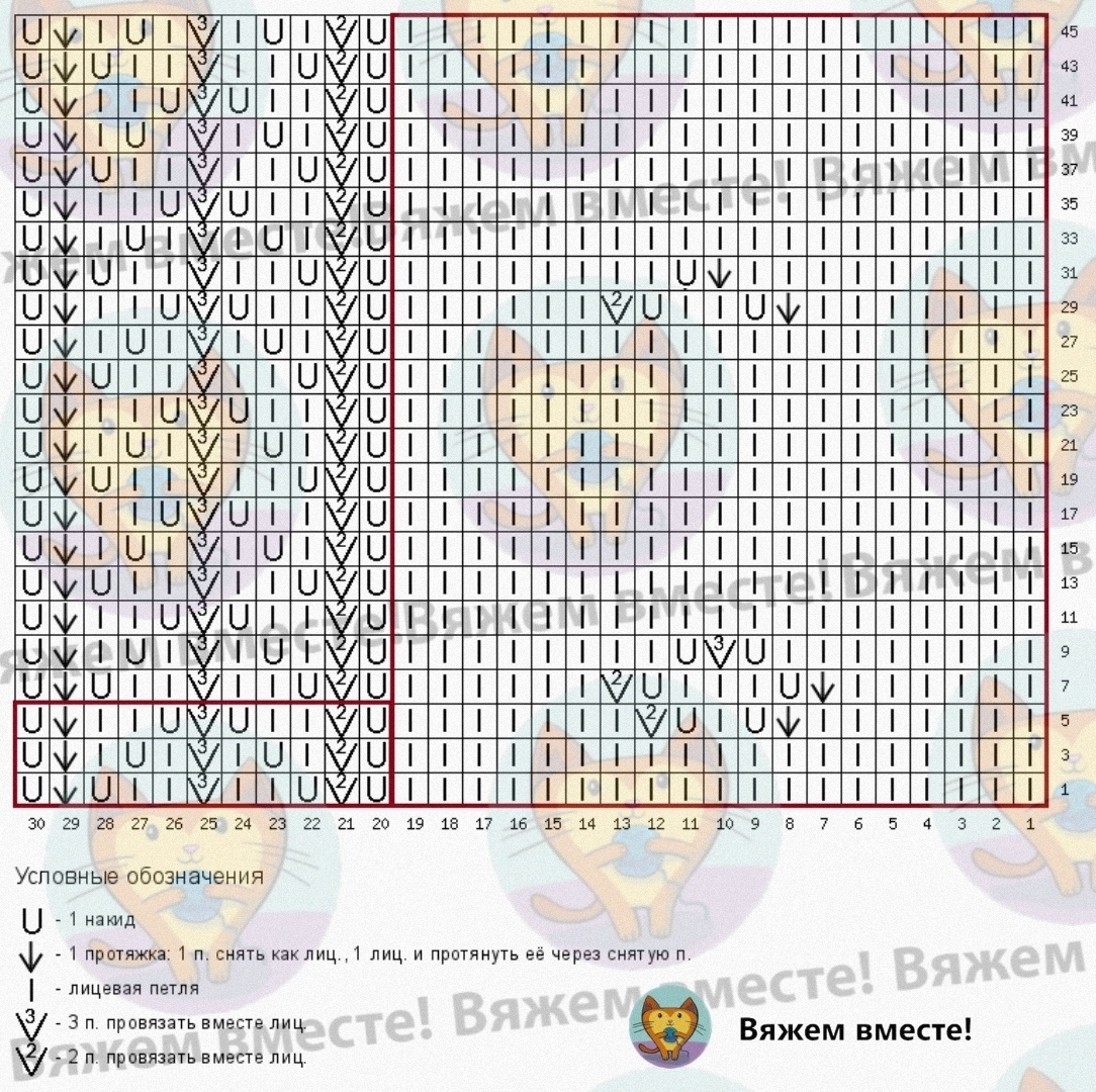 Раппорт узора равен 6 петлям по ширине и 2 рядам по высоте, выделен красной рамкой.