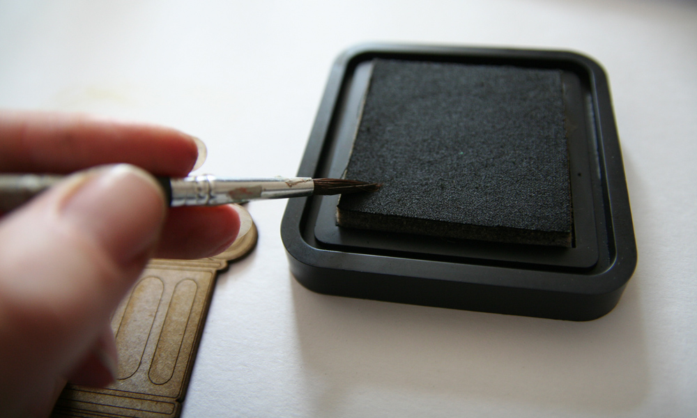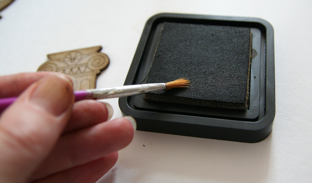Берем кисточку – я использовала капроновую, они мягкие и упругие – и СУХОЙ кисточкой проводим по штемпельной подушке.