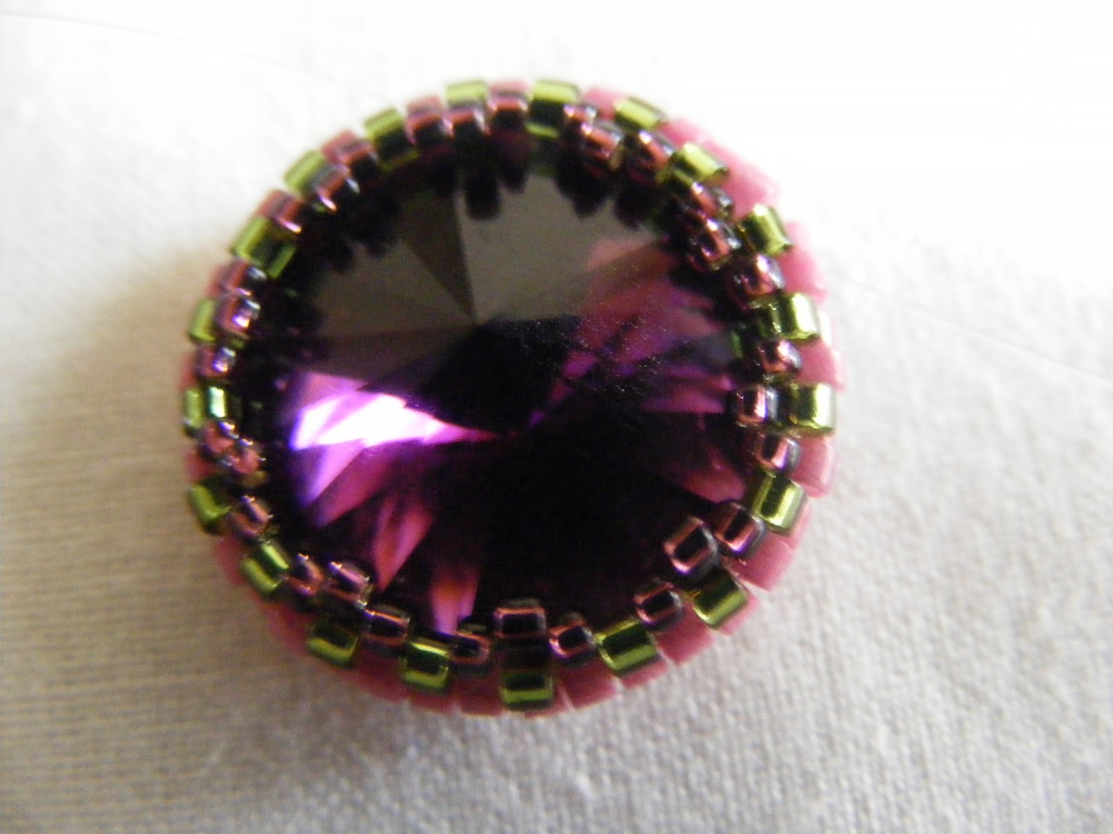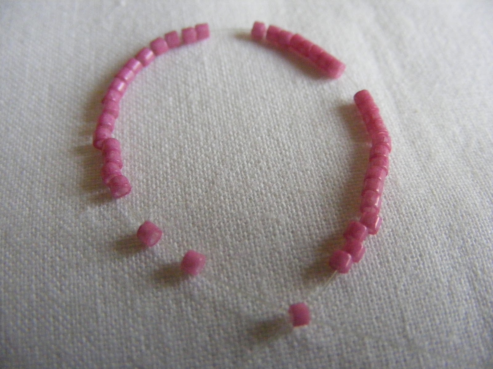 A kezdő soron kívül még két sor delikát fűzünk. Majd 2 sor 15/0 kásával összeszűkítjük a kört. Bele tesszük a delikát.