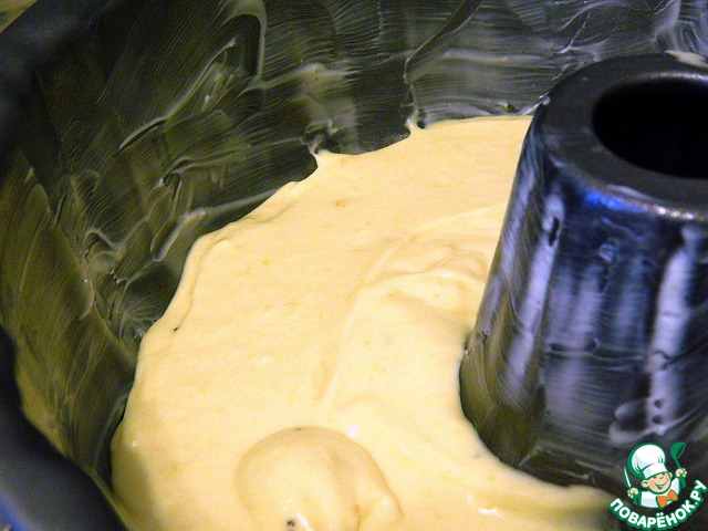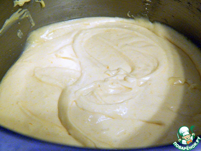 В масляную массу по одному вбиваем яйца и продолжаем взбивать. Когда смесь увеличилась в объеме и стала пышной, начинаем по частям и по очереди вводить просеянную муку с разрыхлителем и сметану. Все хорошо вымешиваем. Тесто получается по консистенции как густая сметана. |