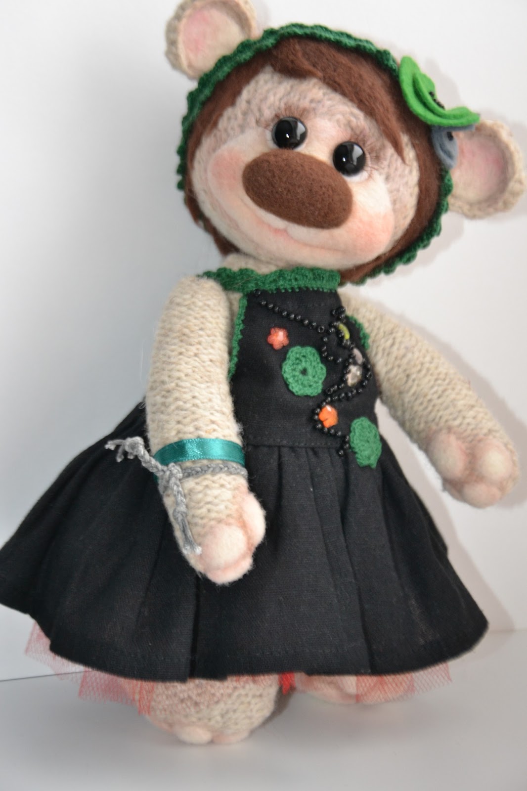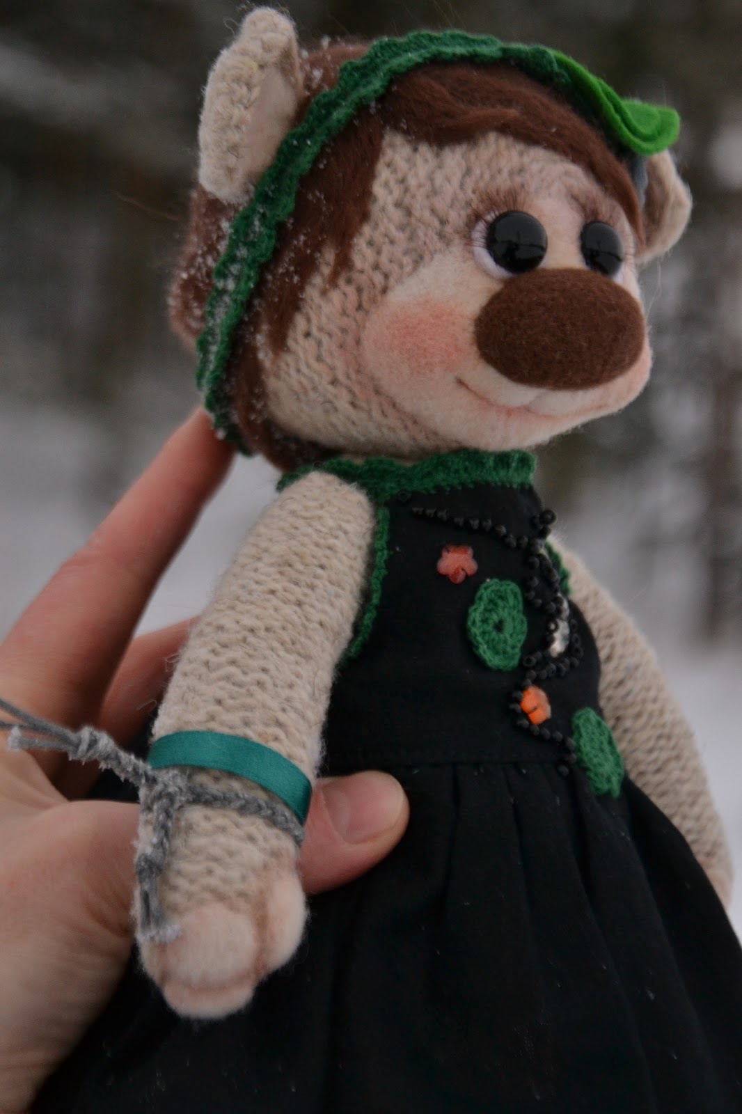 Связана спицами из натуральной неокрашенной шерсти, 6 шплинтов, пробовались тонироваться художественным маслом. Мордочка, лапки, прическа приваляны. Коктейльное платье из льна + чешский бисер + ручное "кружево" + кусочек фатина на нижнюю юбку, снимается, сзади на кнопочках. На последнем фото держу в руке, чтоб сориентировать в размере.