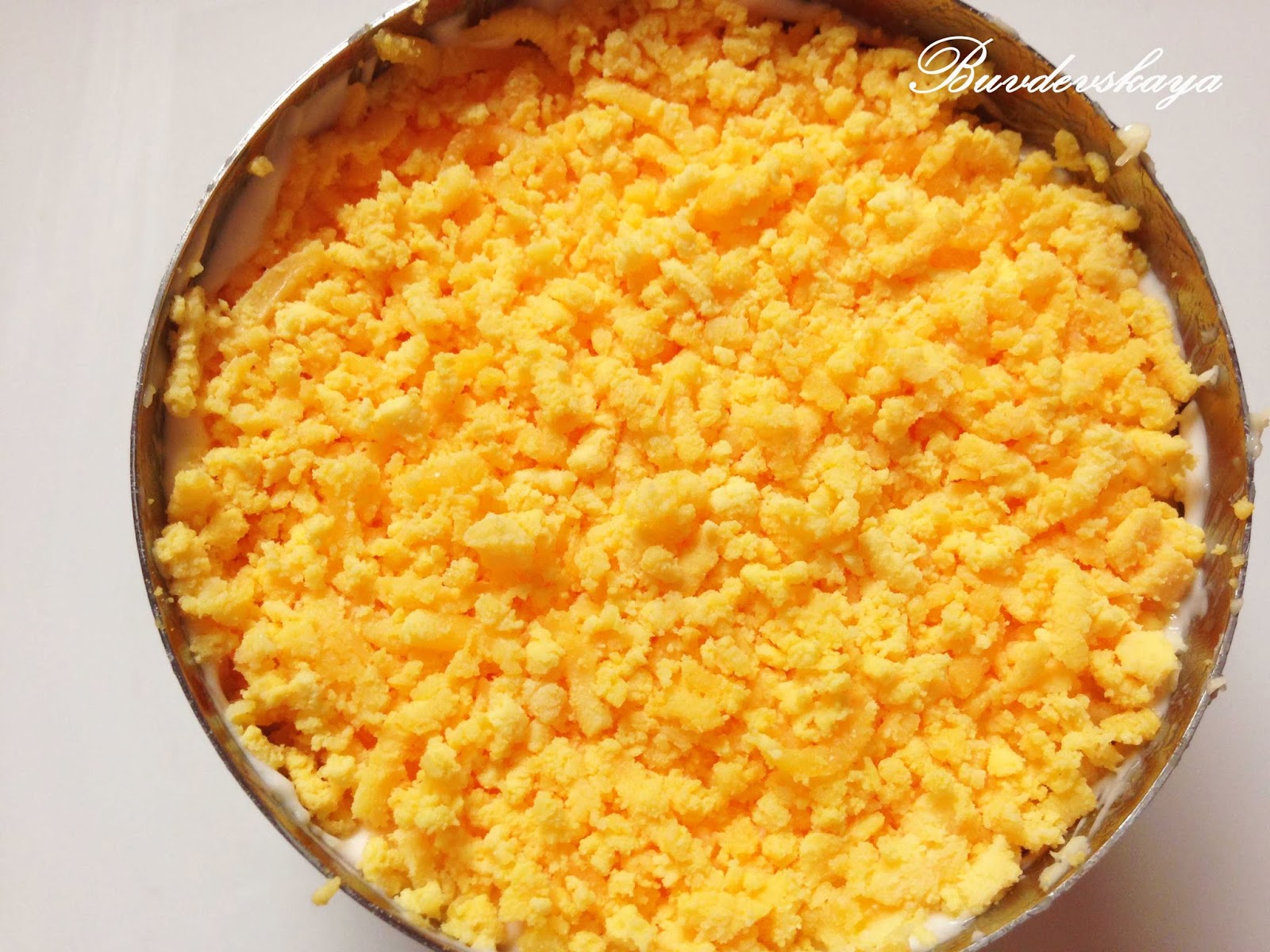 1. Отварить яйца – ровно 10 минут после закипания воды (не больше, чтобы желтки не посерели). Охладить под холодной водой, почистить от скорлупы. Разрезать на пополам и разделить на белки и желтки. Белок натереть на крупной терке и выложить на блюдо. Разровнять и немного смазать домашним майонезом, приготовленным по этому рецепту.