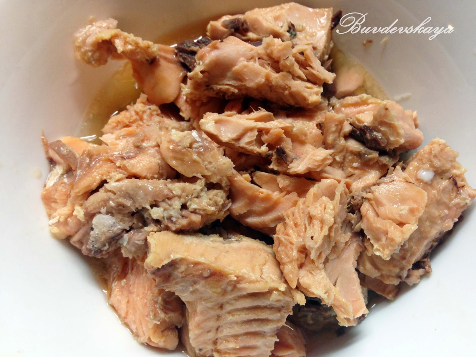 2. Открыть банку с рыбой, сок перелить в миску (НЕ ВЫЛИВАТЬ !) . Отделить рыбу от кожи и костей, переложить в миску с соком и размять вилкой. Выложить слой рыбы на белок, немного поперчить.