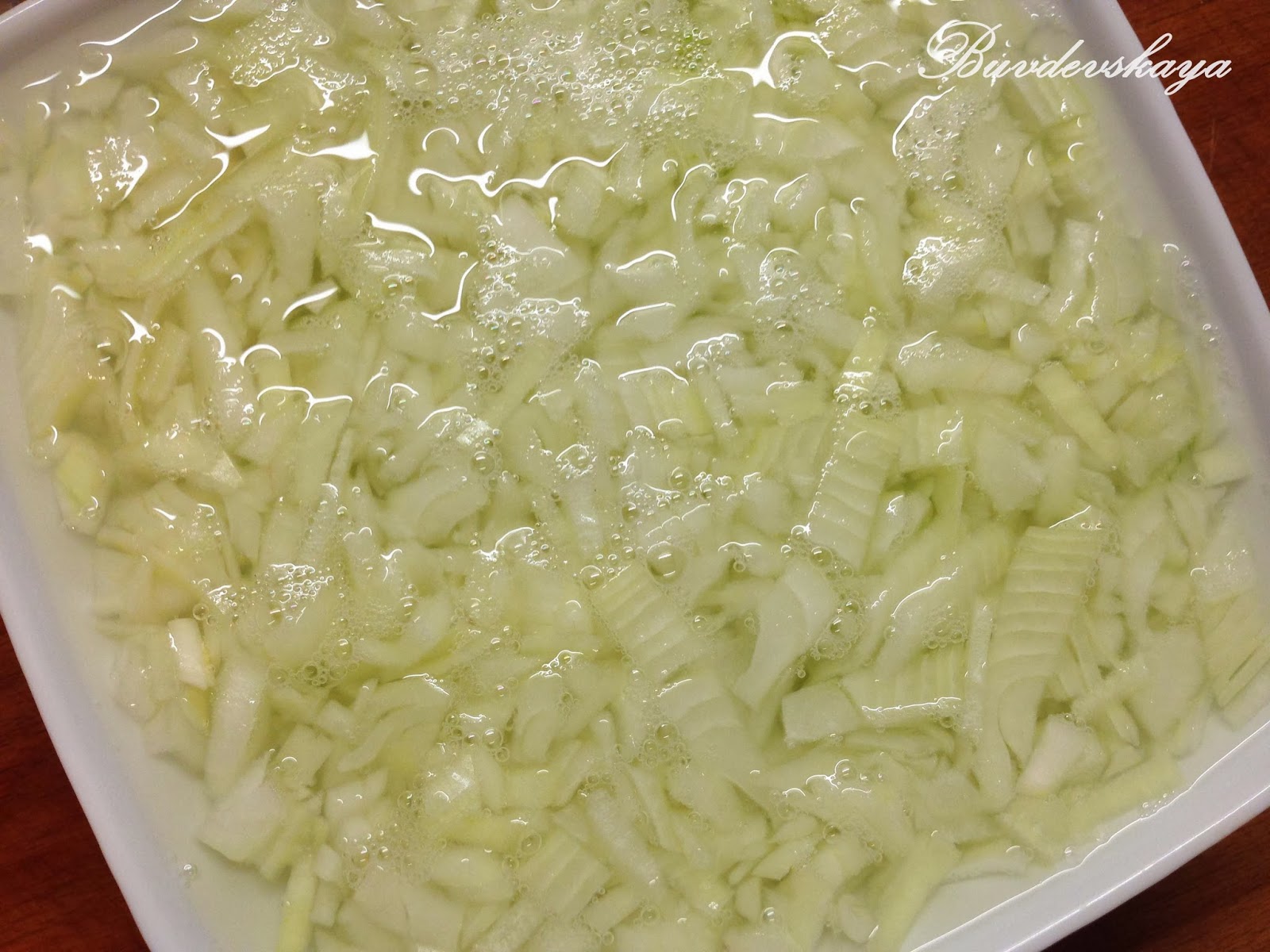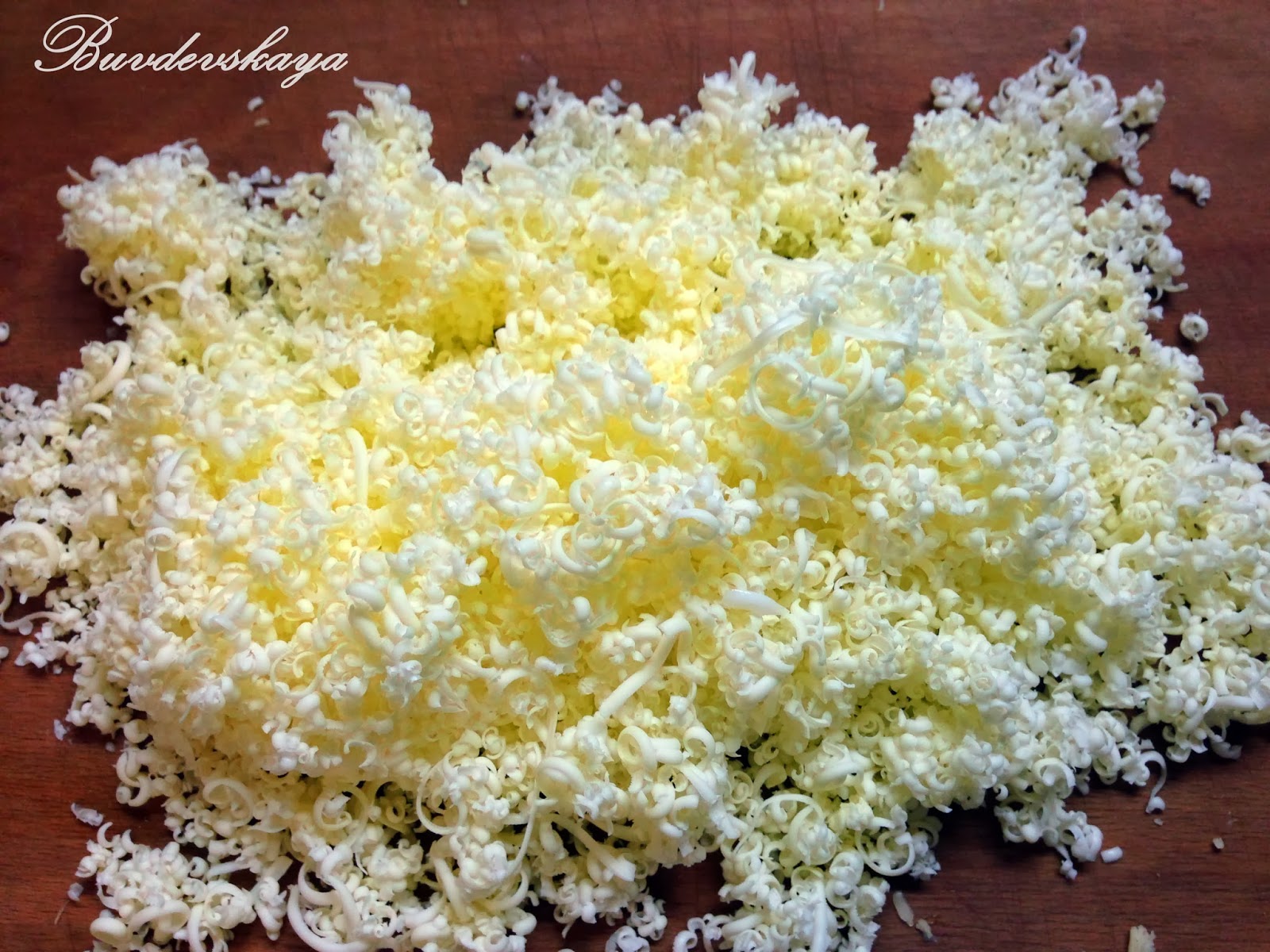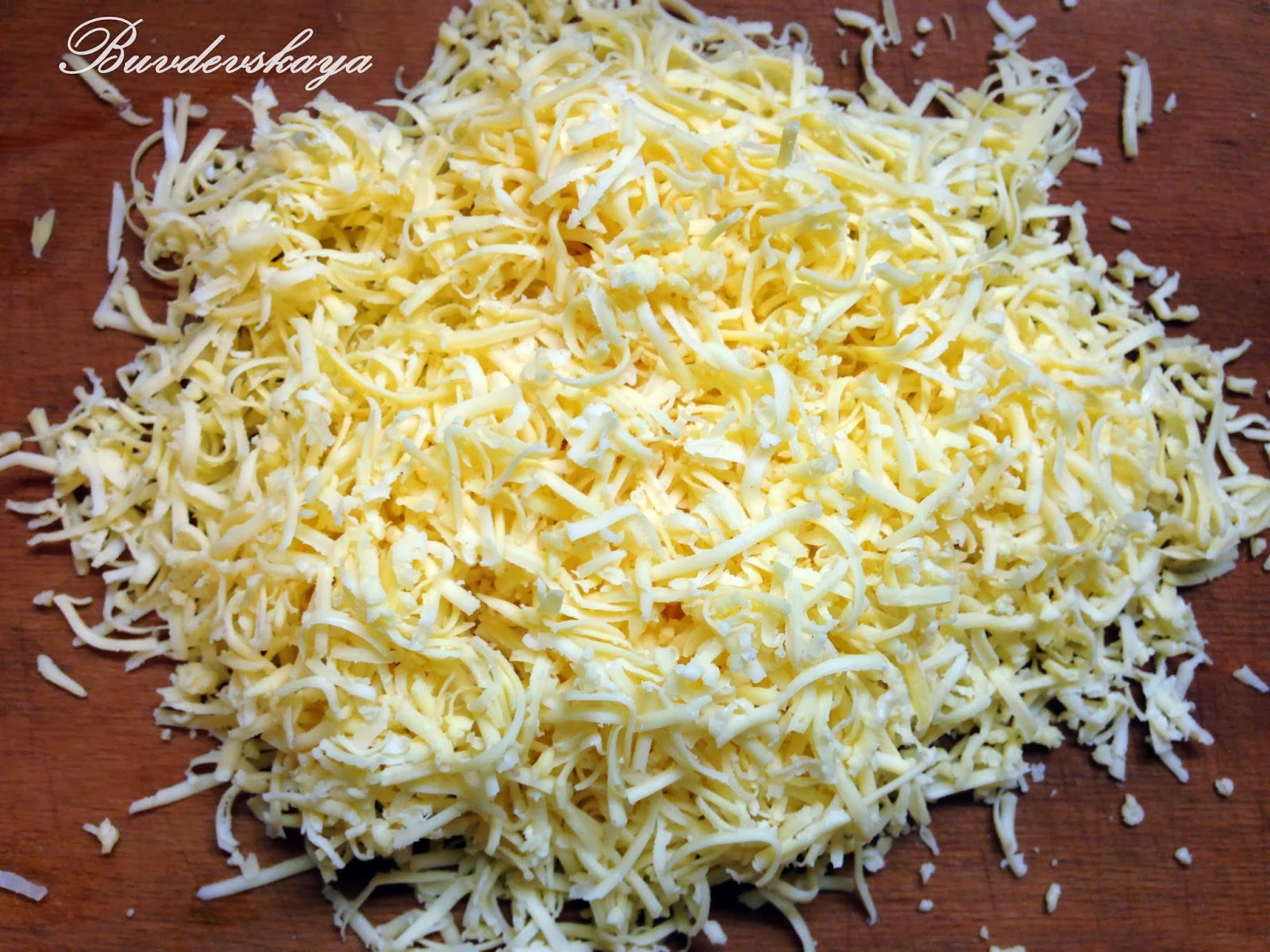 4. На мелкой терке натереть сыр. Если сыр очень мягкий, его можно положить минут на 10 в морозилку, чтобы удобнее было тереть. Выложить слой сыра на лук.