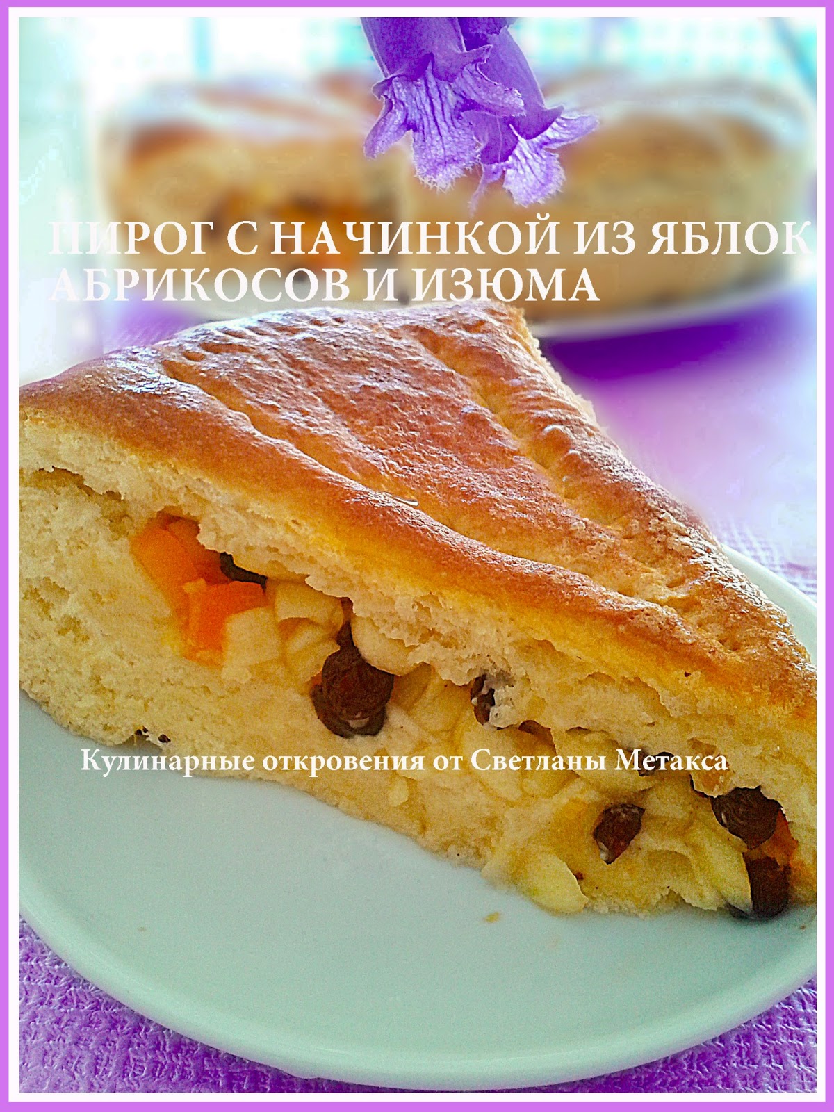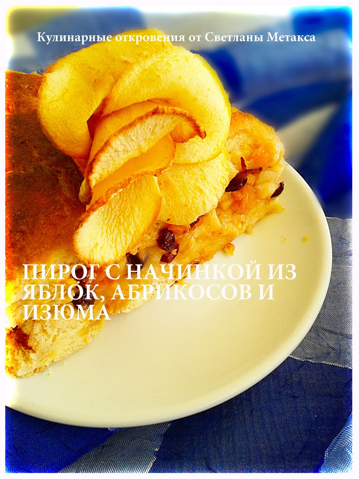 13.Выкладываем начинку из яблок, абрикосов и изюма, равномерно распределяем по поверхности.