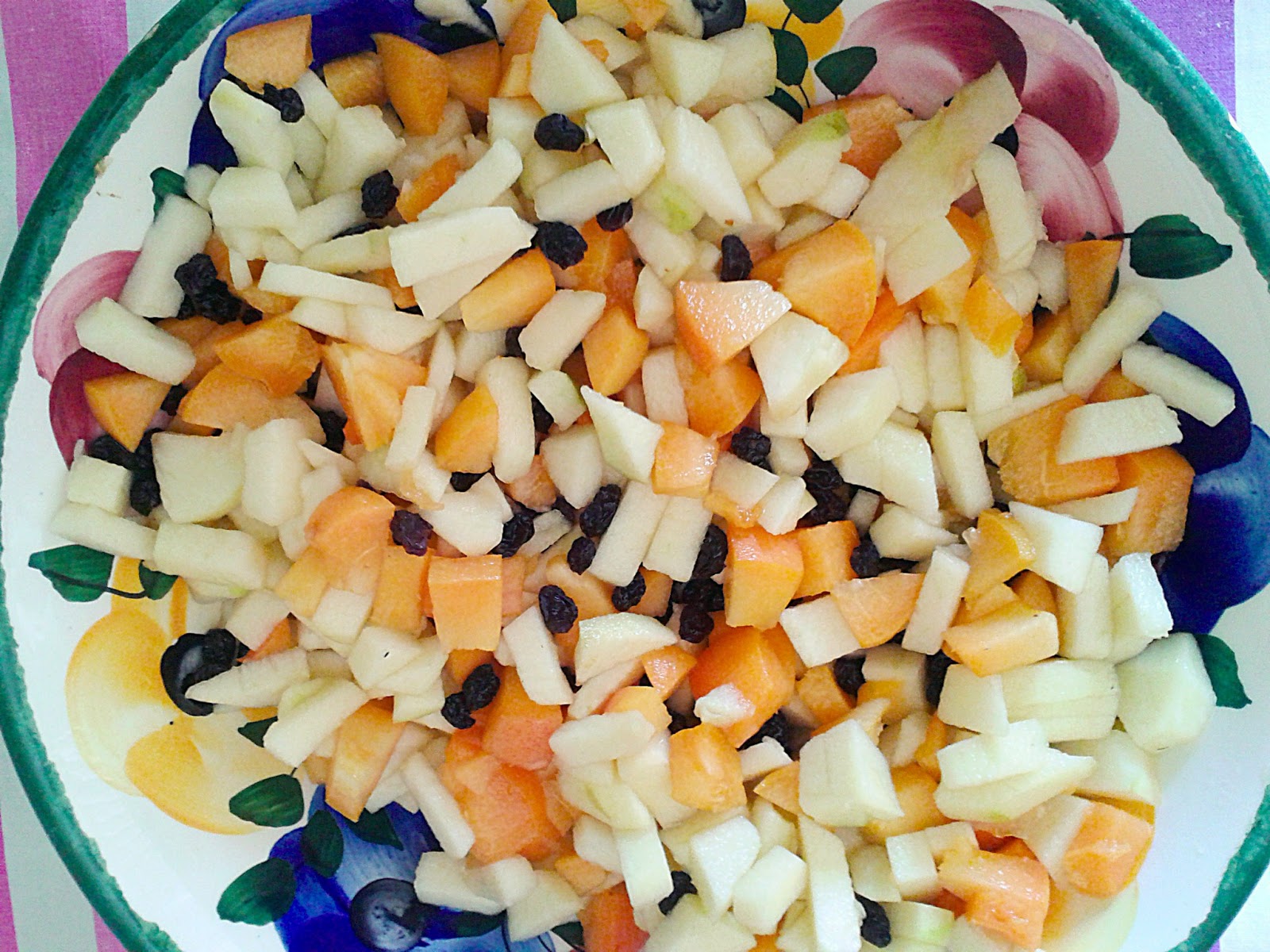 10. Порезать яблоки и абрикосы на маленькие кусочки , выжать лимон, перемешать, добавить изюм и вновь перемешать. Если яблоки и абрикосы кисловатые, можно добавить немного сахара.