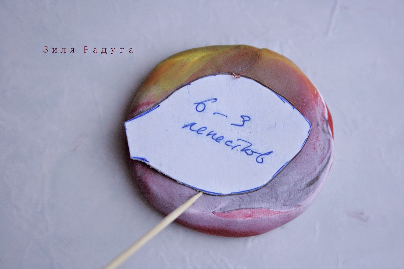 Я делаю молд для лепестка магнолии, поэтому прикладываю к глине лепесток и обвожу его зубочисткой.