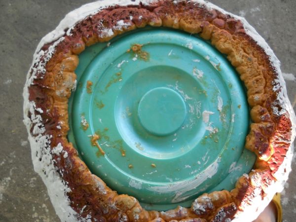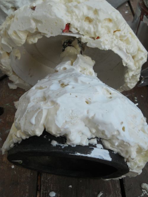 На высокое ведро устанавливаем крышку, чтоб диаметр крышки был больше диаметра ведра. Следуя инструкции на баллончике с пеной, задуваем крышку в виде шляпки гриба. Для того чтобы сэкономить, в центр можно поместить пенопласт или др. подходящий материал. Пеной продуваем и края, и низ.
