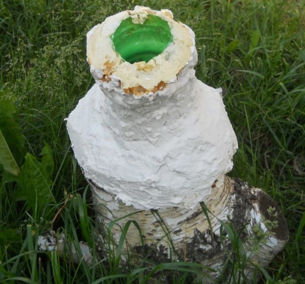 В бутылку насыпаем утяжелитель. Песок или камни. Верх бутылки отрезается так, чтобы она попала в выемки на крышке. Если нет такой возможности, после закрепляем пеной. Ставим на резиновый коврик и формируем ножку гриба.