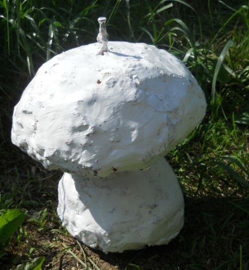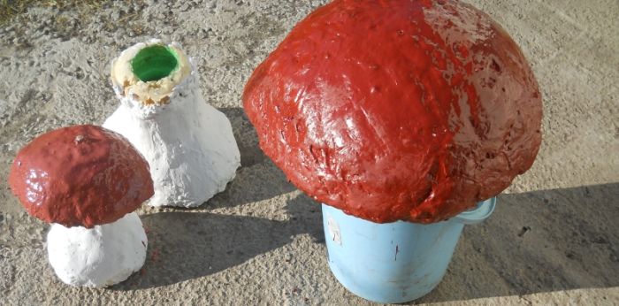 Осталось покрасить шляпки грибов в нужный цвет и выставить в саду.