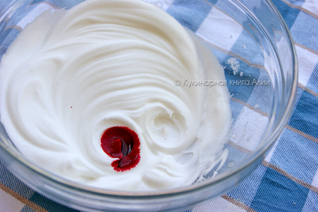 Взбиваем до стойкой пены (чтоб следы от миксера не растекались) и на последней стадии добавляем краситель (гелевый или порошковый и никакой другой!).