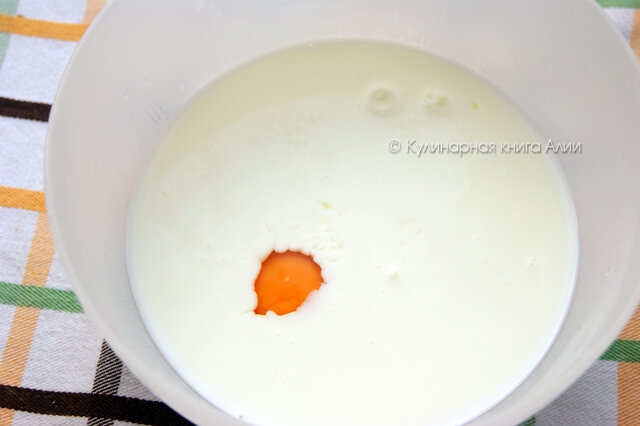 Кефир выливаем в миску, добавляем яйцо, сахар и соль. (Кефир лучше чтобы был комнатной температуры, но у меня он был из холодильника и всё равно все отлично получилось!)