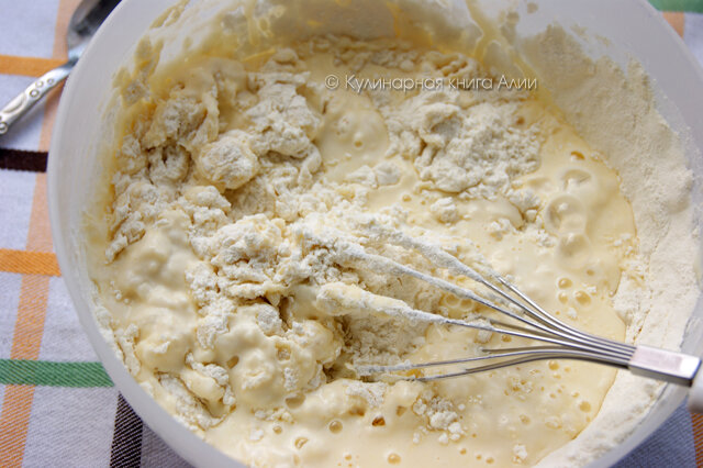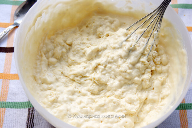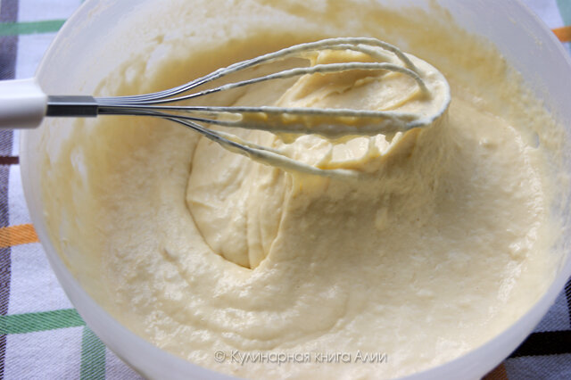 Тесто размешивайте сразу хорошо. Потому что это тесто больше размешивать не нужно. Ему это противопоказано!