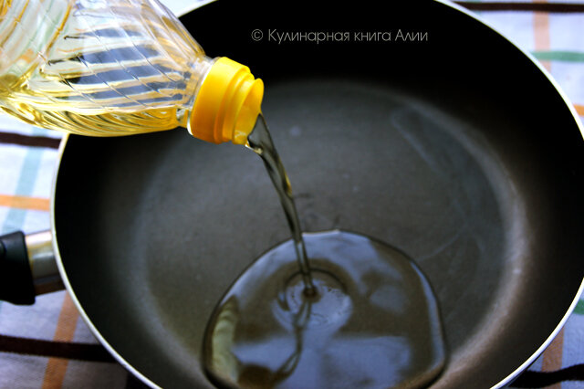 Затем включайте плиту, ставьте сковороду. Я ставлю мокрую сковороду – жду когда она высохнет – значит прогреется, наливаю масло.