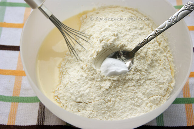 Затем высыпаем муку и соду (соду нужно добавлять именно с мукой, не раньше)