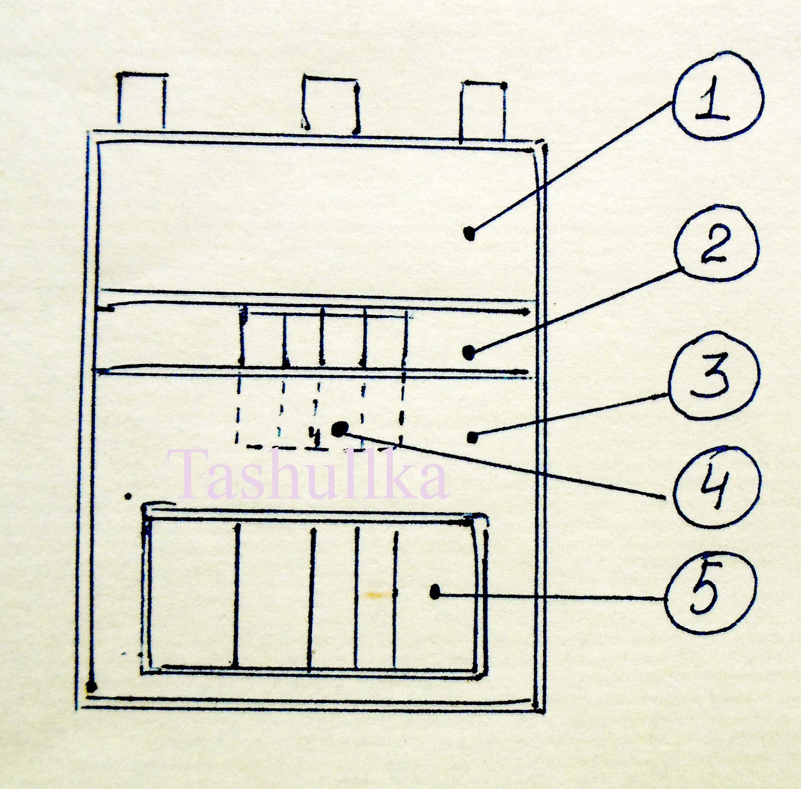 Затем карман №5 снизу и по бокам пришила на деталь №3, вертикальной строчкой разделила деталь №5 сначала на две половины, левую половинку кармана еще пополам прострочила, а правую половинку строчкой разделила на 3 карманчика, 2 узких по 3,5 см.