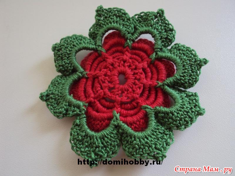 Для вязания цветка вам понадобятся: остатки пряжи х/б красного цвета для цветка и изумрудного для листиков, крючок № 2,5. [показать] Описание вязания цветка: Набирите цепочку из 7-ми возд. петель, замкните ее в колечко соединительной петлей и вяжите первый ряд, сделав 3 возд. петли подъема, 15 ст. с/н. [показать] о втором ряду для начала лепестков вывязываем 8 арочек из 3-х возд петель, вяжите *ст. б/н между столбиков предыдущего ряда, 3 возд. петельки, ст. б/н через 2 столбика предыдущего ряда, повторяйте от* 8 раз. Закончите второй ряд соединительной петлей в первый ст б/н и вяжите 3-й ряд лепесточки, провязывая из арочек ст. б/н, 3 ст. с/н, ст. б/н. Закончите 3-й ряд соединительной петлей
