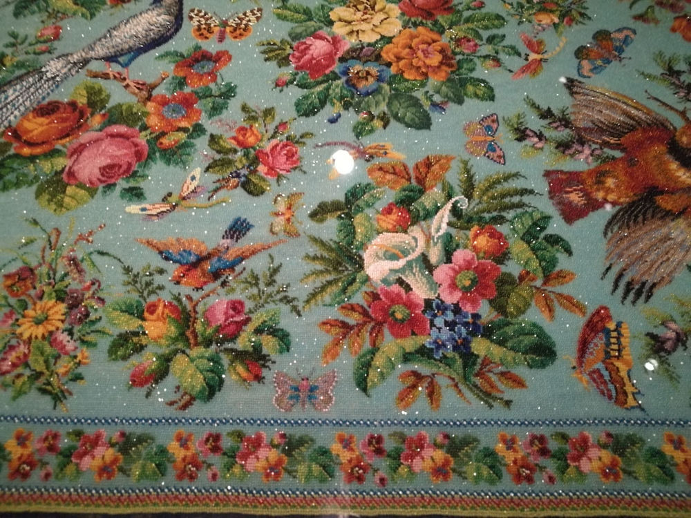 А эта роскошная бисерная скатерть датируется началом XX века. Она была приобретена музеем в 2006 году. Размер основного вышитого полотна — 126 на 118 см без учета длинных бисерных кисточек. Основа скатерти — хлопок. Также в ее изготовлении были использованы прочные шелковые нити.