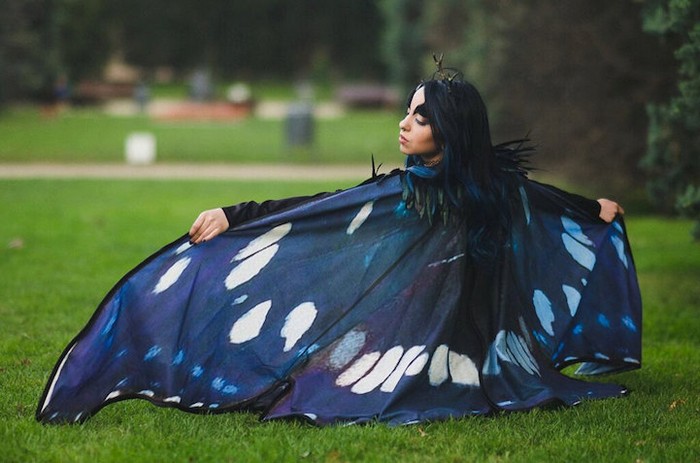 Некоторые «крылья» просто изображены на объемных легких шалях. А другие выполнены в виде накидок для большего реализма. По желанию заказчицы можно даже украсить аксессуар воротником из перьев. Фэнтези, да и только.