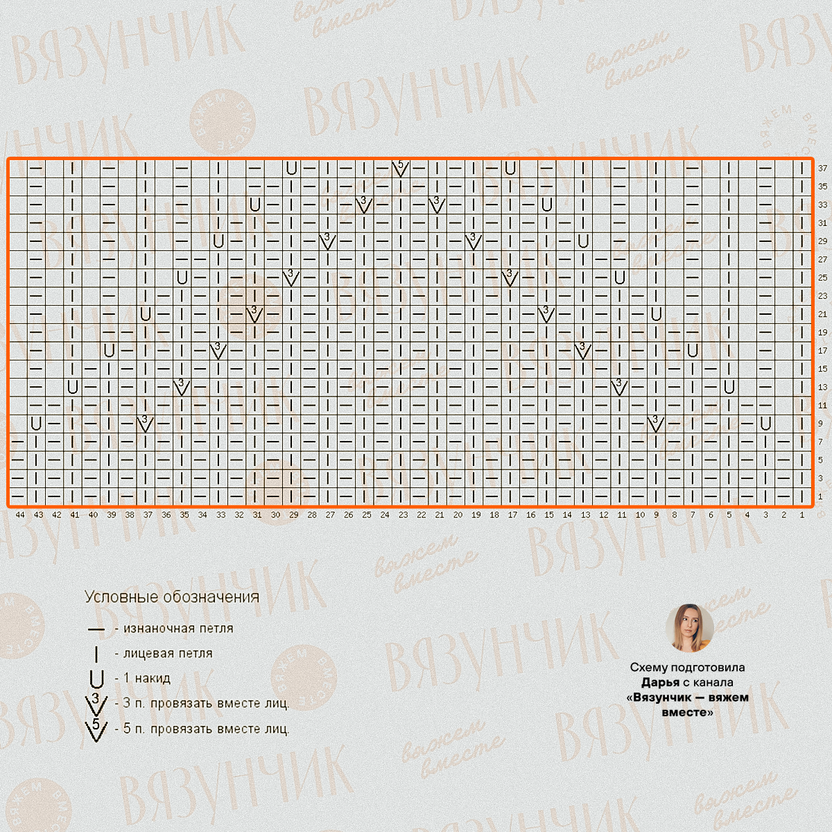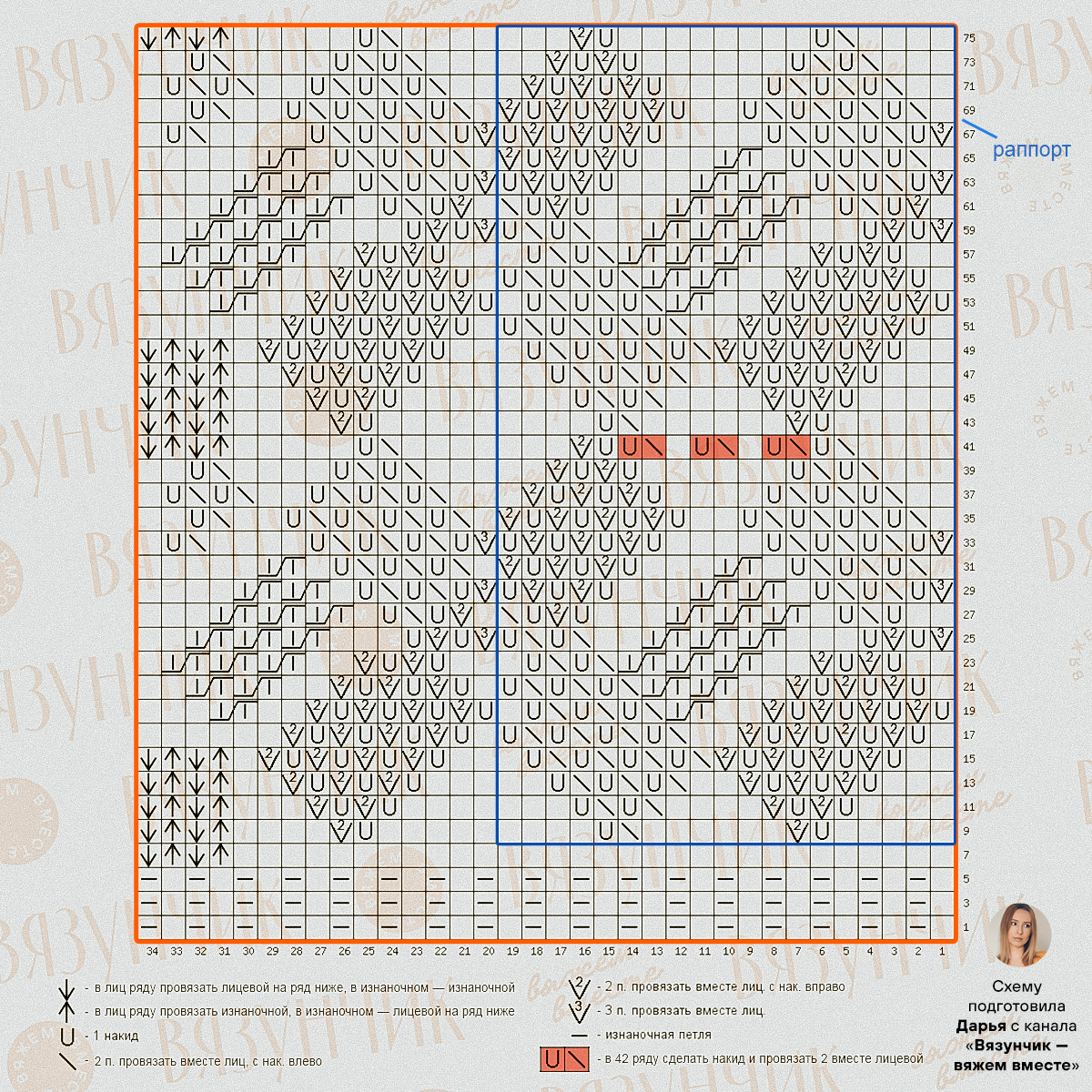 На схемах только лицевые ряды при вязании по кругу. Изнаночные ряды вяжите либо согласно обозначениям, либо по рисунку.