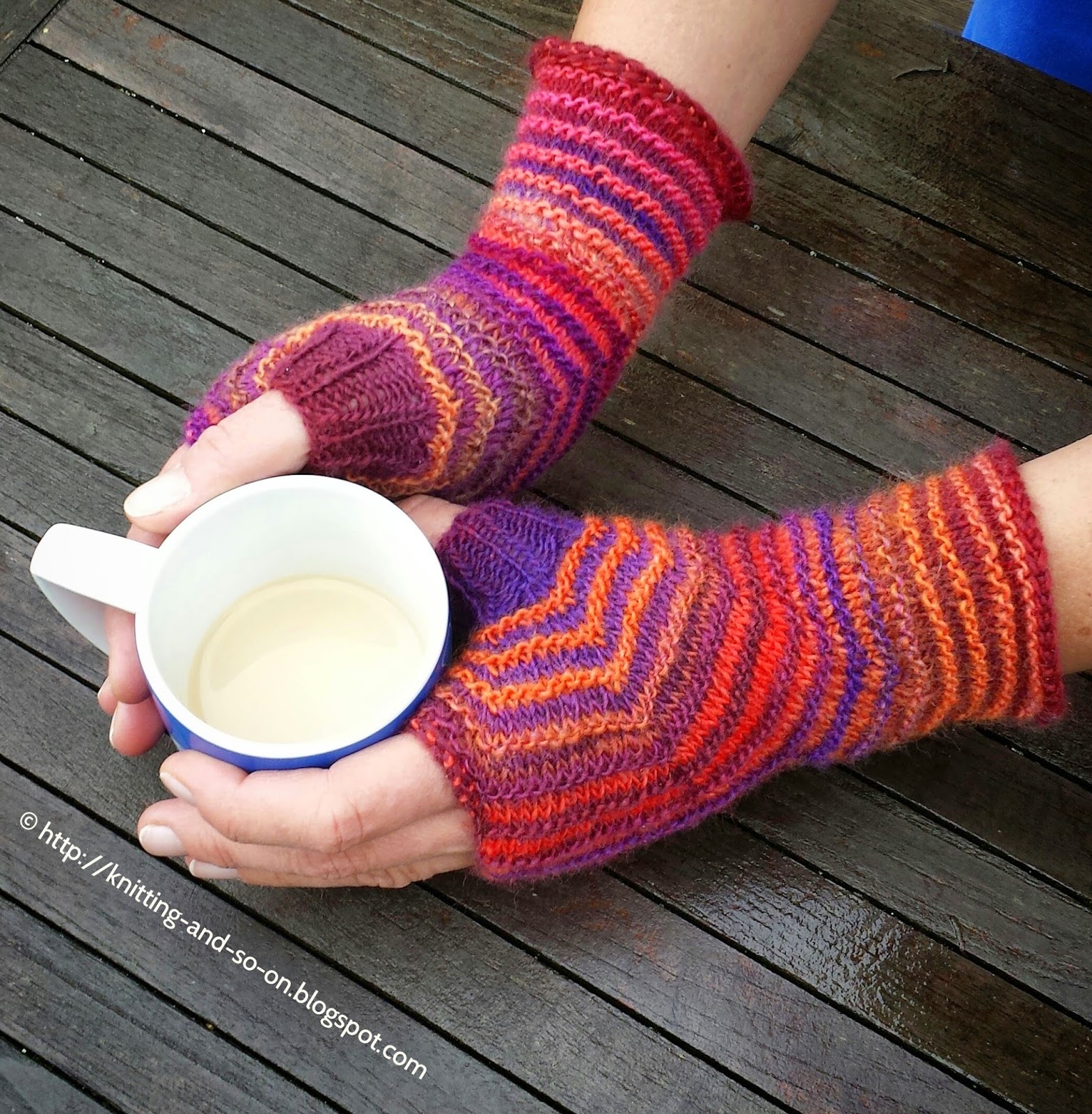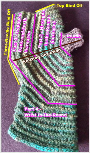 (A Note: I really (really, REALLY) don't like breaking yarn in the middle of a piece - and consequently having to weave in more ends. That's why I go to any length to avoid breaking yarn. In case of these mitts (because of the construction and the colour changes) the yarn is not always where it is needed to be. Therefore, I have used a few "cheats", i.e. stranding the yarn over the first bind-off or knitting in the stitch below. If you don't mind the cutting and the weaving in, you can alternatively break your yarns A and B, slip the stitches to the first marker, start binding off with yarn A there and so on ... )