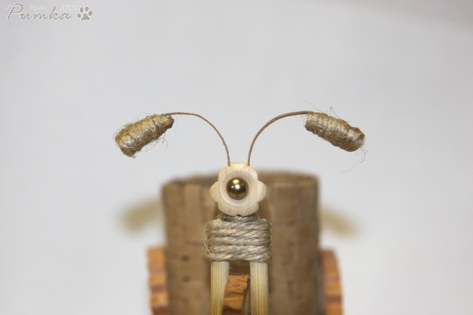 9. Как только клей схватился отрезаем лишнюю палочку оставив примерно 1 см. Торцы палочек лучше по возможности зашкурить. Приклеиваем сверху две полосочки из крафт бумаги "острой" буквой "V", обмазываем клеем и обматываем упаковочным шпагатом: