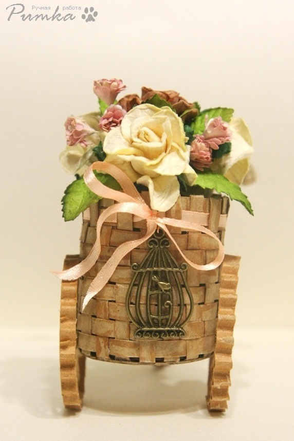 3. Вырезаем еще один кружок из крафт картона, только теперь уже точно 4 см в диаметре и приклеиваем сверху. Загибаем лучики наверх и плетем корзинку. 15 сантиметровой полосочки как раз хватало на окружность,Я каждую полосочку прихватывала клеем в начале и в конце круга.