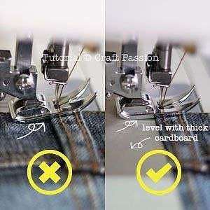 4. Для облегчения строчки на толстых участках подложить картон под заднюю часть лапки, чтобы сравнять плотность участков.
