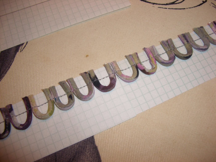 7. А это секретик с заготовкой навесных петелек ...... может кому пригодится). Я делаю заготовку с петлями на листочке в клетку . выкладываю петли по строчу и клеткам лишнее срезаю перегибаю бумагу, чего выйдет смотрю в готовом Виде потом Серия заготовку настрачиваю на своё законное место, бумагу удаляю))) всё ровненько получается, ничего не сдвигается.