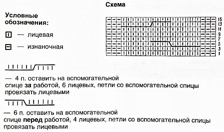 Узор "Коса": вязать по схеме. На схеме приведены только лицевые ряды, в изнаночных рядах петли вязать по рисунку.