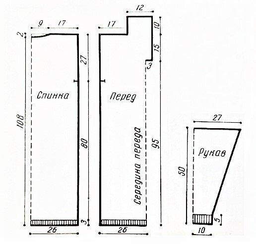 На высоте 105 см. от резинки закрыть для горловины средние 32 п. и обе стороны закончить раздельно: закрыть в каждом 2-м р. 1 раз 5 п. , 1 раз 3 п. и 1 раз 2 п. Затем закрыть по 46 п. плеча.
