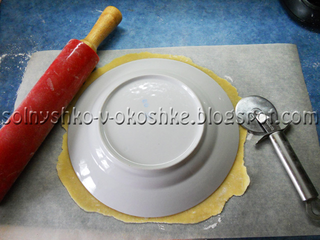 Бумагу для выпечки посыпаем мукой. Раскатываем прямо на ней, обрезаем по удобной форме, у меня это тарелка.