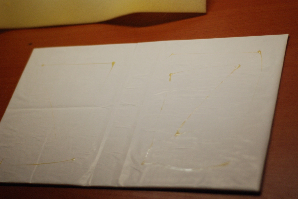 20. Наносим клей момент на черновую обложку, наносите клея совсем мало, чтобы он только схватил поролон.