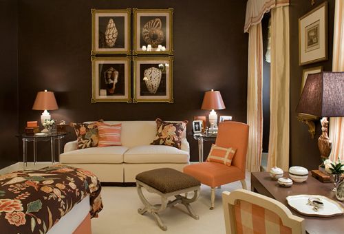 На фоне шоколадных стен надо размещать светлую мебель и аксессуары и наоборот.