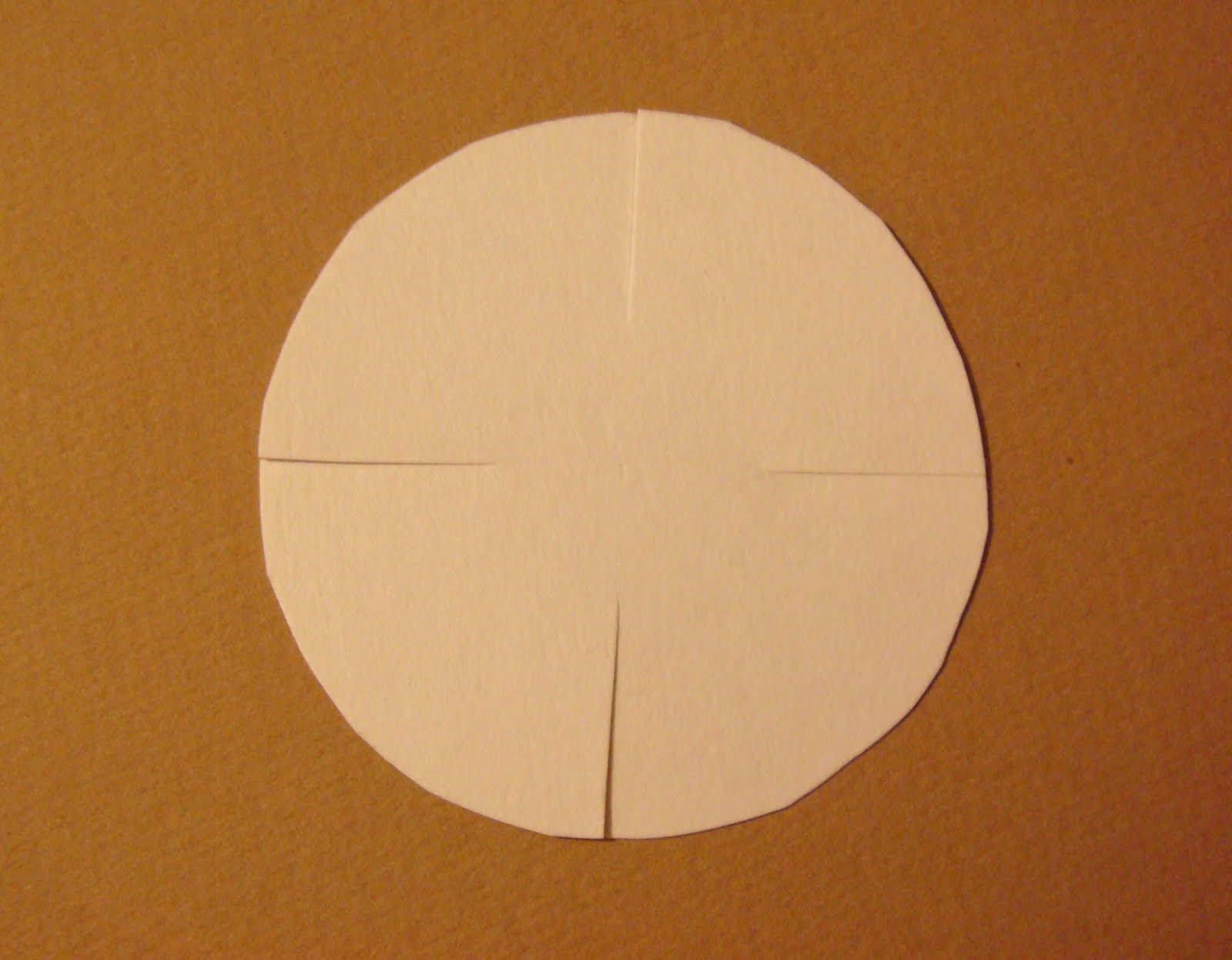 Круг складываем на 4 части, затем ещё пополам, делаем 3 надреза, каждый закругляем. Разворачиваем, делаем надрезы в складках, цветок готов.