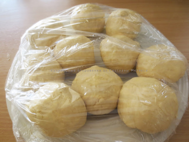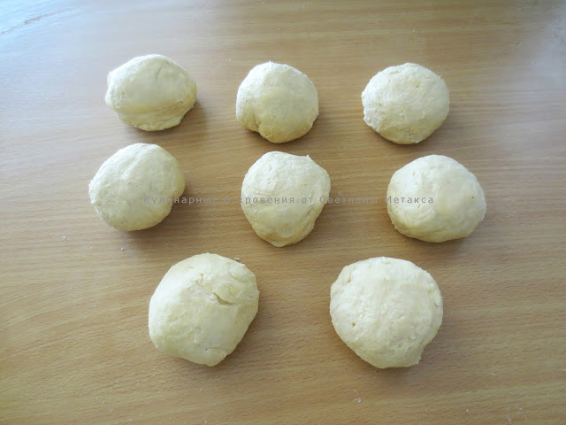 Каждый колобок раскатать в топкую лепешку и вырезать круг, на поверхности сделать несколько проколов, чтобы лепешка не вздулась при выпечке.