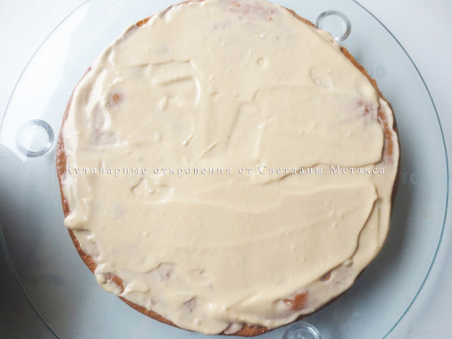 Каждый корж, смазать кремом, укладывая один на другой. Верхний корж и бока также смазать кремом.