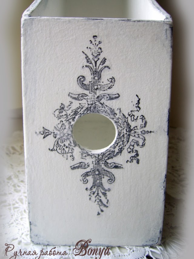 На боковых сторонах очаровательные горшочки с весенними цветами. Рисунок переведен с распечатки старинных гравюр, получился потертым, как и положено. Использовала кракелюр, чтобы состарить основу. Получилось очень винтажно, на мой взгляд. На вид - лет 50, не меньше, основательно потертая и потрепанная временем получилась газетница.