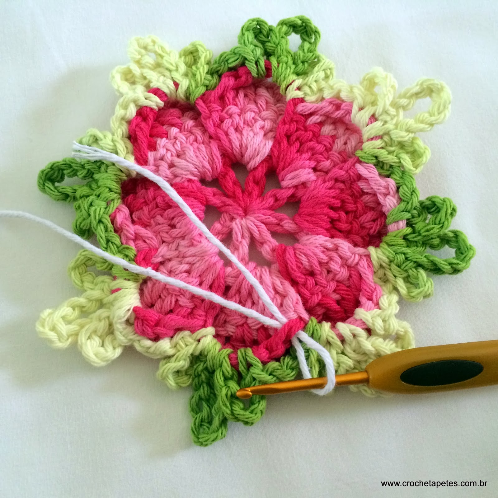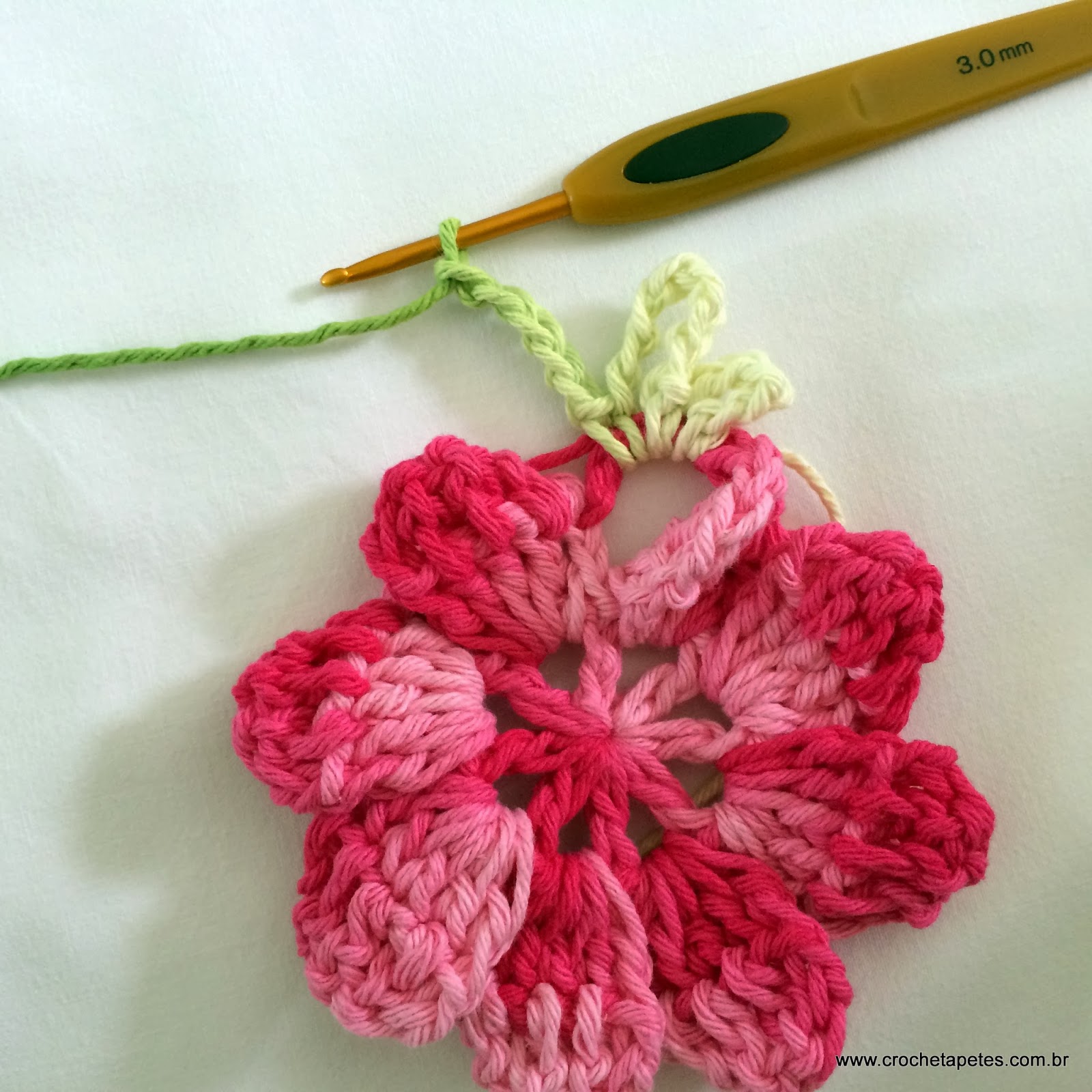 18 - Pelo lado direito da flor faça 5 correntes