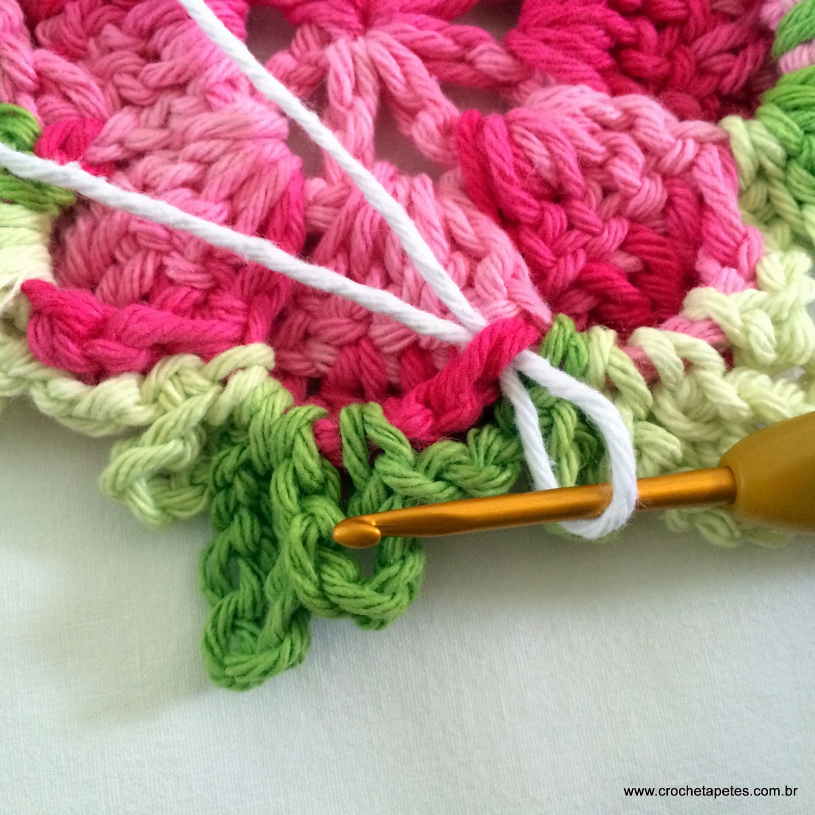 05 - Faça mais 3 pontos baixíssimos voltando na correntinha e chegaremos até a base