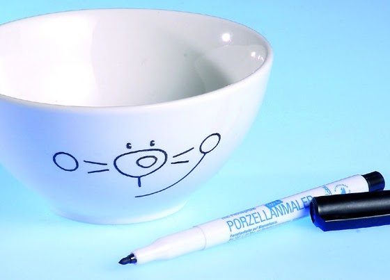 Маркер перед использованием как следует встряхнуть и несколько раз нажать на конец, пока не появится краска.Сначала попробуйте на бумаге. потом начните рисовать на миске. Рисовать следует быстро и осторожно.