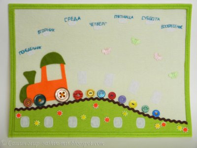 Размер панно 30х40 см. Подвешивается на петли. Использовала фетр, липучку, ленты(жел.дорога, бабочки), пуговицы пришивала пряжей, вышивала дни недели тоже пряжей, цветочки - бусины.
