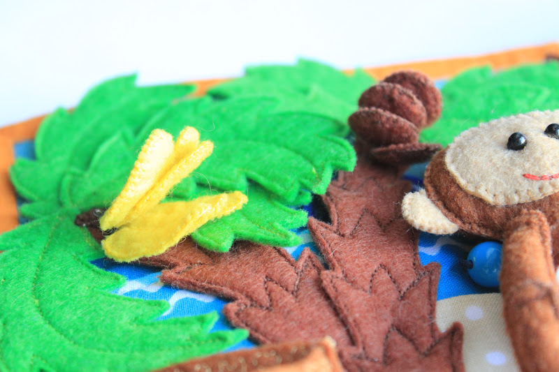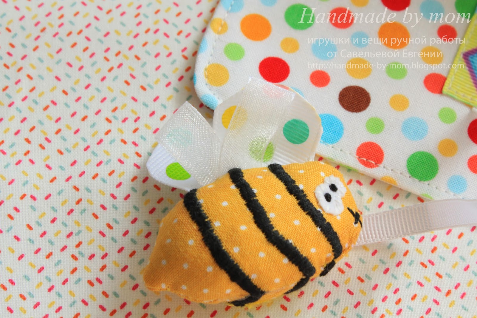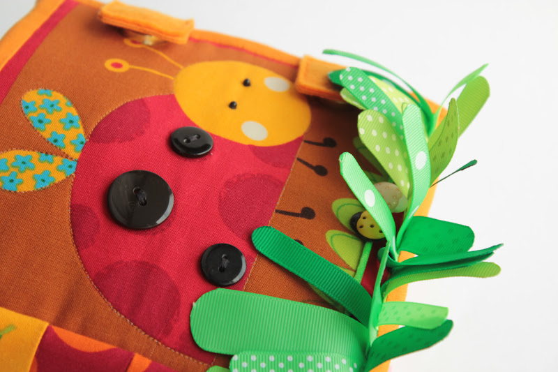 В книжечке есть: шуршащие элементы, липучка, магниты, разнофактурные ткани (иск. кожа, фетр, хлопок, фланель, плотная пленка, ворсистая ткань, сеточка), пищалка, колокольчик, гремелка, различные шнурочки и ленточки, фигурные пуговицы, деревянные фигурные бусины и пластиковые...)