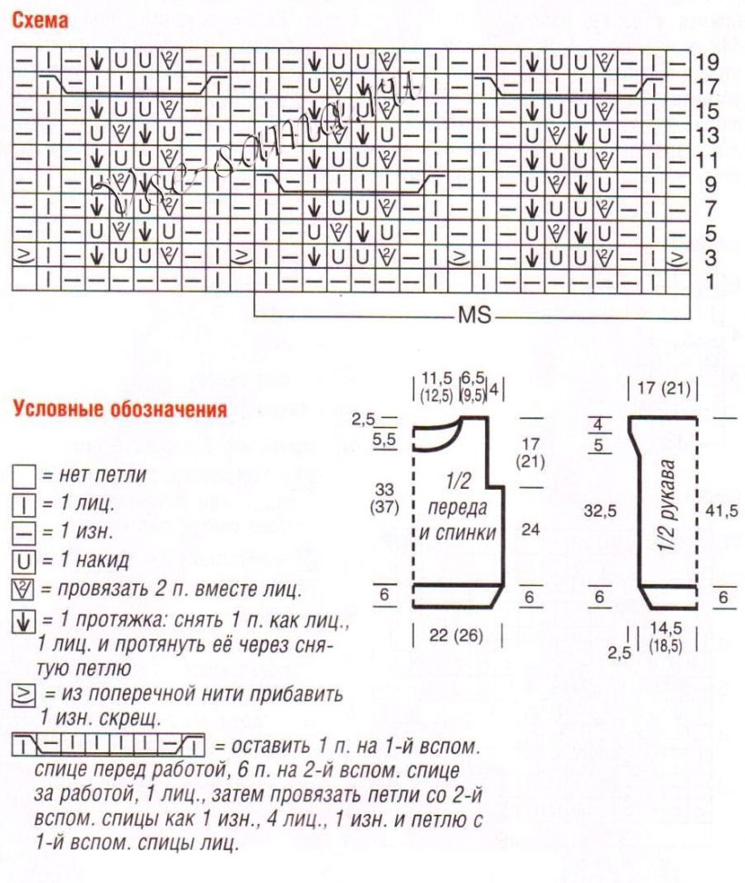 Ажурный узор: сначала число петель кратно 16 + 8 + 2 кром. Вязать по схеме, на которой приведены только лиц. р., в изн. р. петли вязать по рисунку, накиды вязать изн., при 2 накидах подряд вязать 1-й накид изн., 2-й накид лиц. Начинать с 1 кром., повторять раппорт, заканчивать петлями после раппорта и 1 кром. Связать 1 раз с 3-го по 20-й р., затем повторять с 5-го по 20-й р. После 3-го р. схемы число петель кратно 18 + 10 + 2 кром.