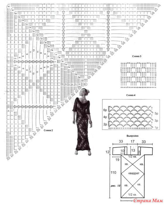 платье вязаное крючком вечернее схема бесплатно Вяжите квадраты по схеме 1, треугольники по схеме 2. Готовые детали треугольников и квадратов обвяжите одним рядом СБН и соедините между собой в процессе обвязки согласно выкройке.