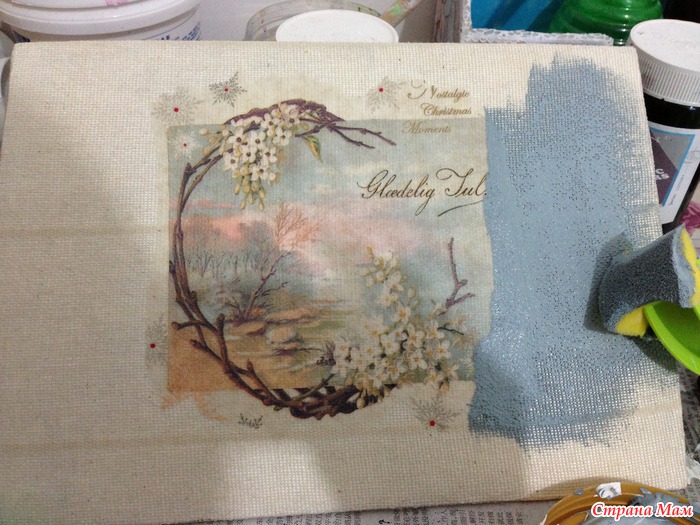 Тонируем. Я сначала делала мазки губкой, чтобы равномерно распределить краску, а потом чпокала.